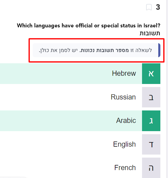 במידה והמרצה הגדיר שיש מספר תשובות נכונות לשאלה ובחר שתידרשו לבחור במספר תשובות זהה למספר התשובות הנכונות, יוצג לכם חיווי על כך (מעל התשובות):