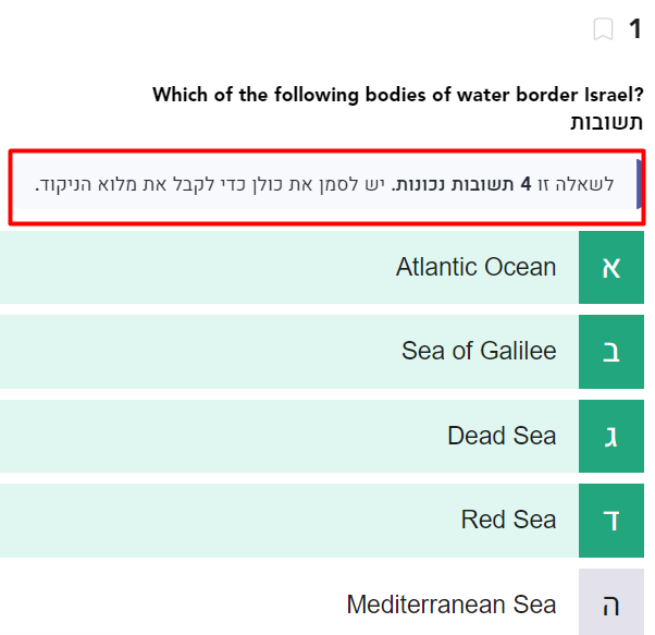 - מענה על שאלה סגורה: יש ללחוץ על מספר/אות התשובה הרצויה, ניתן לבחור רק תשובה אחת. התשובה שנבחרה תצבע בצבע ירוק.