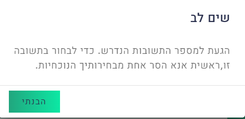 - ביטול תשובה: במידה וברצונכם לבטל את התשובה שבחרתם, לחצו שוב על התשובה. תופיע ההודעה הבאה: