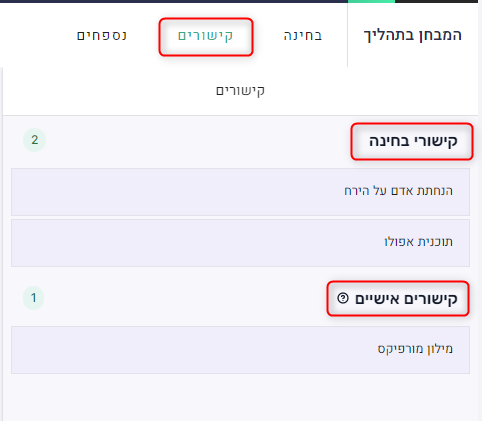1. קישורי בחינה - קישורים שזמינים לכל הסטודנטים.